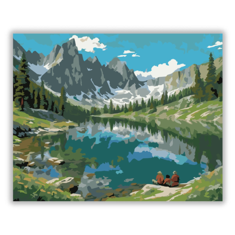 Alpesi Tópart Vadvirágokkal - számfestő készlet – 40×50 cm (Keret nélkül) A festmény egy kristálytiszta alpesi tavat ábrázol, amelyet zord sziklák és vadvirágokkal tarkított zöld rétek vesznek körül. Az élénk zöld és kék színek dominálnak, nyugodt és harm