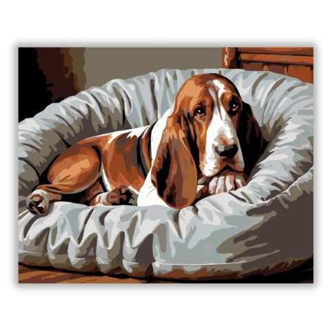 Alvó Basset Hound Kényelmes Ágyon - számfestő készlet – 40×50 cm (Keret nélkül) A festmény egy álmos Basset Houndot ábrázol, amint egy puha kutyaágyon pihen, hosszú fülei lazán lógnak a szélén. A barna, fehér és szürke árnyalatok nyugodt, meghitt hangulat