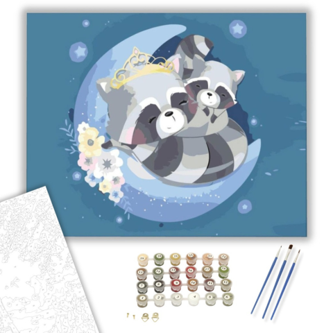 Alvó mosómedvék - számfestő készlet – 40×50 cm (Keretre feszítve) Ez a festmény nyugalmat áraszt, ahogy a mosómedvék békésen szundítanak az éjszakai égbolt alatt. A kép egy mesebeli történetet sejtet, ahol a hold hintázik álmosan a csillagok között. A kék