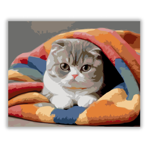 Alvó Skót Lógófülű Macska Színes Takarón - számfestő készlet – 40×50 cm (Keret nélkül) A festmény egy alvó skót lógófülű macskát ábrázol, amint egy színes, puha takarón pihen. A meleg, élénk színek barátságos és otthonos hangulatot teremtenek. A kép a nyu