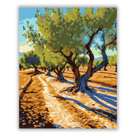 Andalúziai Olajfaliget - számfestő készlet – 40×50 cm (Keret nélkül) A festmény egy csendes andalúziai olajfaligetet ábrázol aranyóra fényében, ahol az öreg, csavart fák hosszú árnyékokat vetnek a száraz talajra. A kompozíció meleg, napfényes színei medit