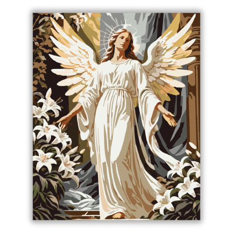 Angyal Megjelenése - számfestő készlet – 40×50 cm (Keret nélkül) A festmény egy angyalt ábrázol, amint fehér liliomok között áll, aranyló fényben és dicsfényben. A kép meleg árnyalatai és a ragyogó színek áhítatot és békét sugároznak. Az angyal megnyugtat