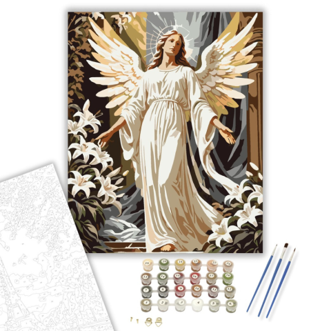 Angyal Megjelenése - számfestő készlet – 40×50 cm (Keretre feszítve) A festmény egy angyalt ábrázol, amint fehér liliomok között áll, aranyló fényben és dicsfényben. A kép meleg árnyalatai és a ragyogó színek áhítatot és békét sugároznak. Az angyal megnyu
