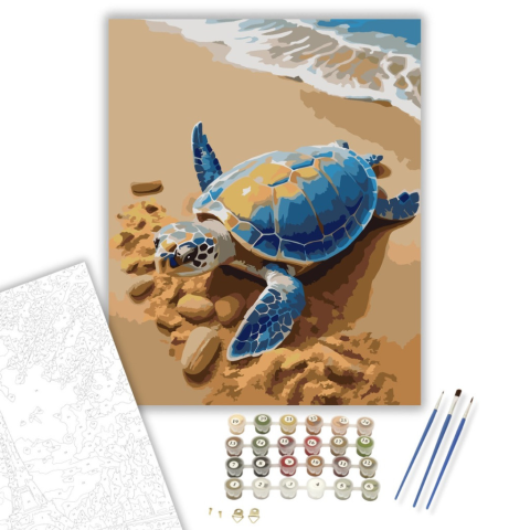 Apró Teknős a Parton - számfestő készlet – 40×50 cm (Keretre feszítve) A festmény egy apró tengeri teknőst ábrázol, amint a homokos parton halad a hullámok felé. A kék és arany árnyalatok harmóniája meleg és nyugodt hangulatot teremt. A kép a természetes