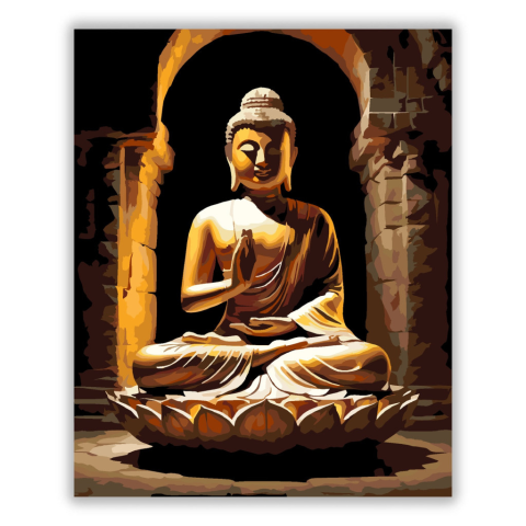 Arany Buddha Barlangtemplomban - számfestő készlet – 40×50 cm (Keret nélkül) A festmény egy arany Buddhát ábrázol, aki lótuszülésben pihen egy kőből készült barlangtemplom belsejében. A meleg arany fények és a gyertyafény által vetett árnyékok békés és mi