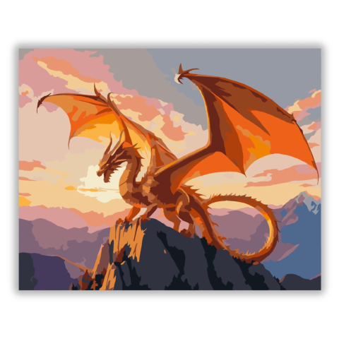 Arany Sárkány a Hegyek Felett - számfestő készlet – 40×50 cm (Keret nélkül) A festmény egy arany sárkányt ábrázol, amint egy hegycsúcs fölött áll, háttérben a naplemente. A narancs és arany színek tüzes, drámai hangulatot teremtenek az égbolton. A kép az