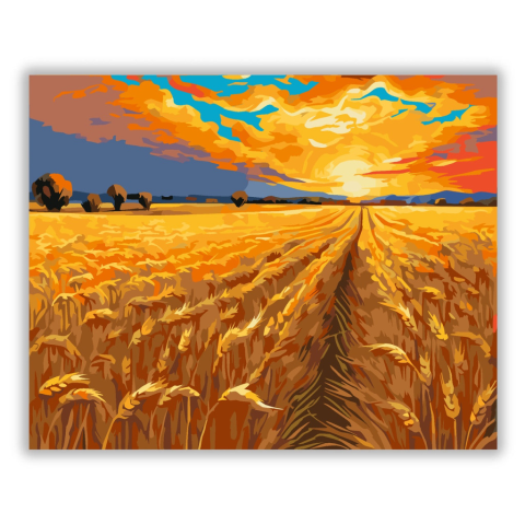 Aranyló Búzamezők Szépsége - számfestő készlet – 40×50 cm (Keret nélkül) A festmény a lenyugvó nap fényében fürdő aranyló búzamezőt ábrázolja, gazdag színekben és lendületes ecsetvonásokkal. Az élénk narancs és sárga árnyalatok harmonikusan keverednek, ki