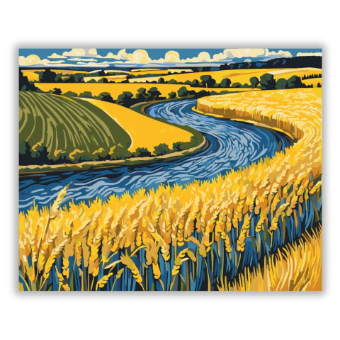 Aranyló Mezők Látomása - számfestő készlet – 40×50 cm (Keret nélkül) A kép egy gazdag búzamezőt ábrázol, amelyet kanyargó folyó választ el a zöldellő domboktól. Az élénk sárga és kék színek, valamint a lendületes ecsetvonások erőteljes kontrasztot teremte