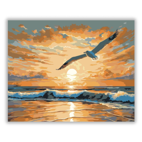 Aranyló Napkelte a Tengeren - számfestő készlet – 40×50 cm (Keret nélkül) A festmény egy aranyló napkeltét ábrázol a nyugodt óceán felett, ahol a nap első sugarai fénylő ösvényt rajzolnak a hullámokra, miközben egy magányos sirály szárnyal a ragyogó horiz