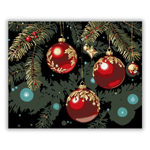 Aranyló Ünnepi Csillogás - számfestő készlet – 40×50 cm (Keret nélkül) A kép az ünnepi fenyőágakat ábrázolja, melyeken ragyogó aranyfüsttel díszített piros gömbök csillognak. Az ágak között megbújó gyertyák fényét idéző kék és zöld pöttyök varázslatos hát