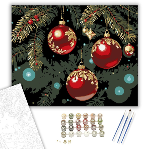 Aranyló Ünnepi Csillogás - számfestő készlet – 40×50 cm (Keretre feszítve) A kép az ünnepi fenyőágakat ábrázolja, melyeken ragyogó aranyfüsttel díszített piros gömbök csillognak. Az ágak között megbújó gyertyák fényét idéző kék és zöld pöttyök varázslatos