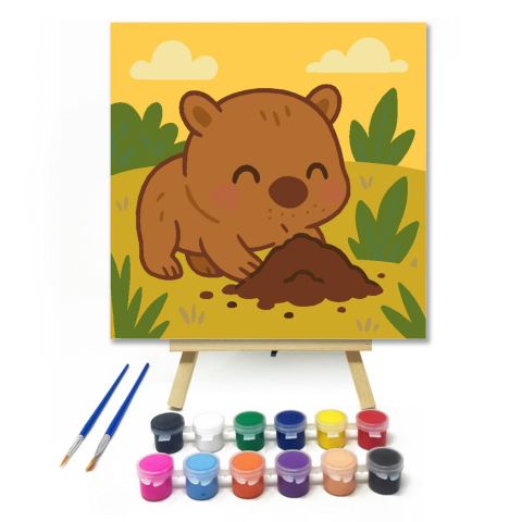 Aranyos Kismackó a Természetben - gyerek számfestő készlet – 20×20 cm (Keret nélkül) A kép egy kis mackót ábrázol, aki boldogan játszik a földön egy kis dombocskával körülvéve. A meleg barna és zöld színek barátságos, napsütötte hangulatot teremtenek. Tök