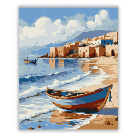 Atlanti-óceán Partja Halászhajókkal - számfestő készlet – 40×50 cm (Keret nélkül) A festmény Marokkó atlanti partvidékét ábrázolja, ahol halászhajók ringatóznak a hullámokon egy csendes falu mellett. A kék és arany színek harmóniája nyugodt, idilli hangul