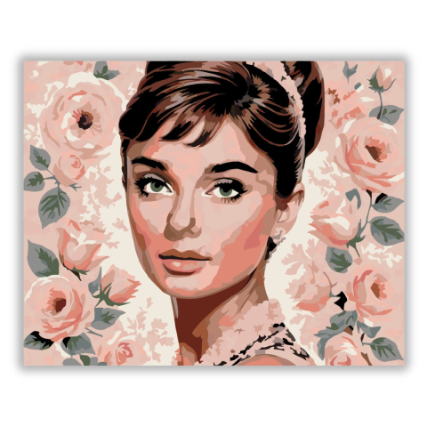 Audrey Hepburn Portré - számfestő készlet – 40×50 cm (Keret nélkül) A festmény Audrey Hepburnt ábrázolja, lágy rózsaszín árnyalatokkal és finom virágmintákkal az arca körül. A részletek kidolgozása és a kifejező szemek romantikus és elegáns stílust kölcsö