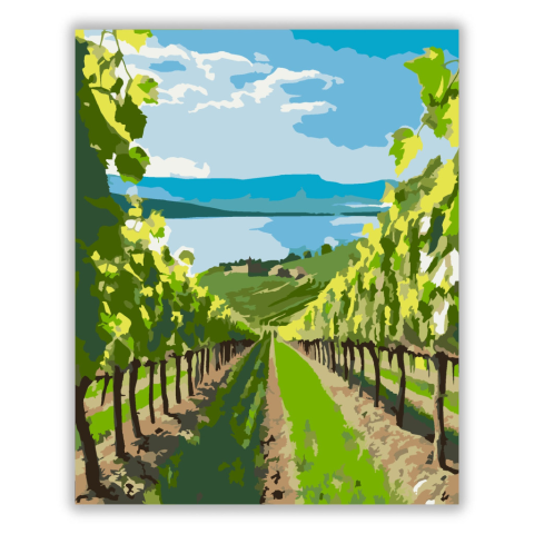 Badacsonyi Szőlőskert - számfestő készlet – 40×50 cm (Keret nélkül) A festmény Badacsony szőlőskertjeit ábrázolja, háttérben a bazalt hegyekkel és a távolban csillogó Balatonnal. A zöld szőlőtőkék és a kék ég harmonikus kontrasztja nyugodt és idilli hangu