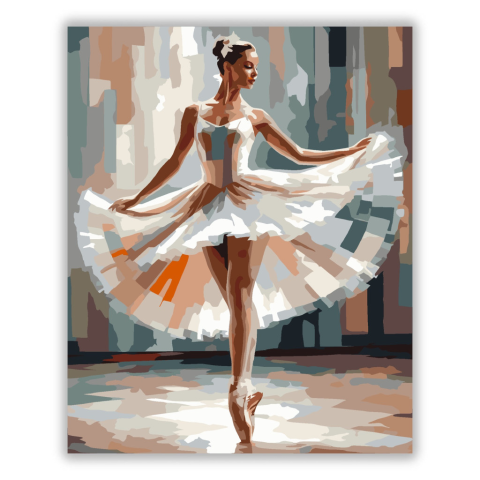 Balerina Piruett Közben - számfestő készlet – 40×50 cm (Keret nélkül) A festmény egy balerinát ábrázol, miközben kecsesen piruettezik. Lágy, áramló vonalak és finom megvilágítás ragadják meg a mozgás pillanatát. A kép eleganciát és könnyedséget sugároz. E