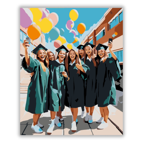 Ballagó Fiatalok Színes Lufikkal - számfestő készlet – 40×50 cm (Keret nélkül) A festmény egy csoport fiatalt ábrázol ballagási talárban, amint önfeledten szelfiket készítenek az iskola előtt. A kép színvilága élénk a színes lufiknak és a kék égnek köszön