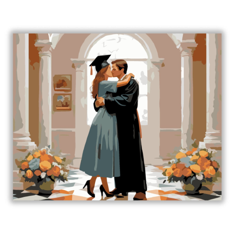 Ballagó Pár Ölelése - számfestő készlet – 40×50 cm (Keret nélkül) A festmény egy végzős párt ábrázol ölelésben, elegáns ballagási ruhában egy oszlopos folyosón. A meleg színek, mint a narancs és kék, ünnepi és romantikus hangulatot teremtenek. A kép a dip