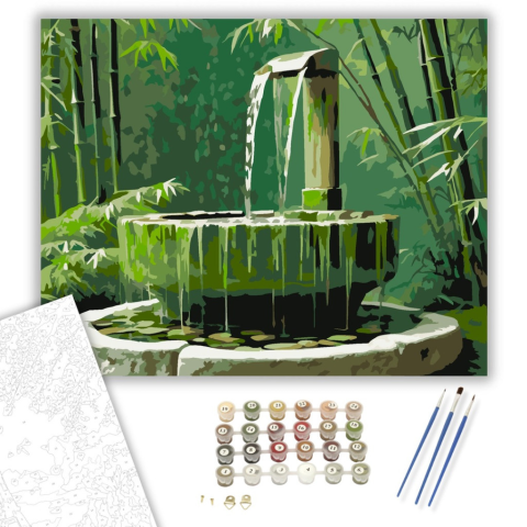 Bambusz Vízkút Zen Kertben - számfestő készlet – 40×50 cm (Keretre feszítve) A festmény egy bambuszból készült vízkutat ábrázol, amelyből a víz egy kerek kőmedencébe csordogál. A zöld, természetes színek és a környező bambuszok harmóniát és nyugalmat sugá