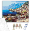 Bámulatos Kilátás - számfestő készlet – 40×50 cm (Keretre feszítve) A festmény egy nyugodt, idilli hangulatot áraszt, mintha egy csendes délutánba pillantanánk be a tengerparti városka életébe. A háttérben húzódó hegyek és a vibráló kék víz között megbúvó