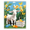 Bárány és Színes Húsvéti Tojások - számfestő készlet – 40×50 cm (Keret nélkül) A festmény egy fehér bárányt ábrázol, aki színes húsvéti tojásokkal teli láda mellett áll, körülötte nárciszok és pillangók. A kép élénk sárga, kék és zöld árnyalatokkal sugáro