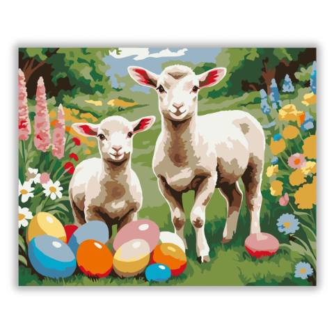 Bárányok és Színes Húsvéti Tojások - számfestő készlet – 40×50 cm (Keret nélkül) A festmény két bájos bárányt ábrázol, akik egy virágokkal teli kertben állnak, ahol színes húsvéti tojások sorakoznak. A kép élénk színei, mint a zöld, sárga és rózsaszín, vi