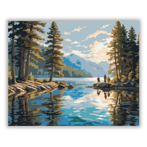 Barátok a Tóparton - számfestő készlet – 40×50 cm (Keret nélkül) A festmény egy napfényes tavat ábrázol, ahol barátok kavicsokat hajigálnak, miközben a víz tükrözi a környező fákat és hegyeket. A kép élénk színekben pompázik, a napfény játékával a hullámo