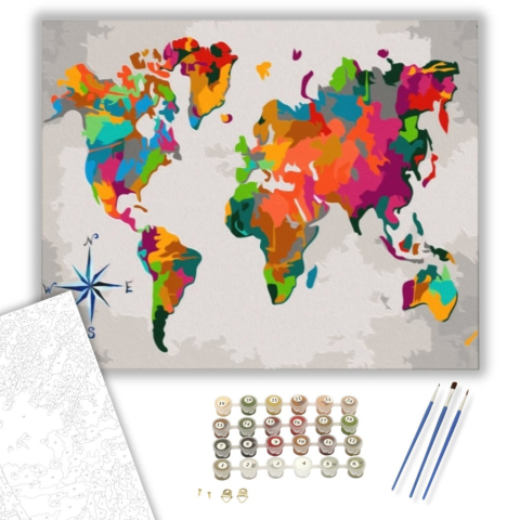 Barna és Színes Világtérkép - számfestő készlet – 40×50 cm (Keretre feszítve) Készíts gyönyörű műalkotásokat, előzetes festő tudás nélkül! Éld át az alkotás gyönyörű pillanatait és varázslatos hangulatát! Akkor is gyönyörű festményeket hozhatsz létre, ha