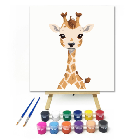 Barna zsiráf - gyerek számfestő készlet – 20×20 cm (Keretre feszítve) Ez a kép egy bájos barna zsiráfot ábrázol, aki kíváncsian néz a világra hosszú nyaka mögül. A meleg barna és bézs árnyalatok igazán barátságos, vidám hangulatot sugároznak. Ideális vála