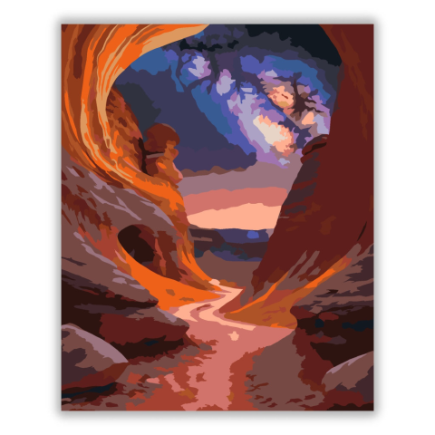 Barred Spirálgalaxis és Kanyon - számfestő készlet – 40×50 cm (Keret nélkül) A festmény egy izzó narancsszínű sziklaformációkkal teli sivatagi kanyont ábrázol, mely felett egy fénylő barred spirálgalaxis húzódik. Az égbolt mélykék és lila árnyalatai a nap