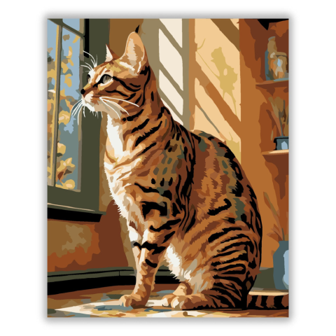 Bengáli Macska a Napsütésben - számfestő készlet – 40×50 cm (Keret nélkül) A festmény egy bengáli macskát ábrázol, amint a napsütötte szobában ül, figyelve az ablakon túli világot. Az arany és barna árnyalatok meleg, barátságos hangulatot teremtenek. A ké