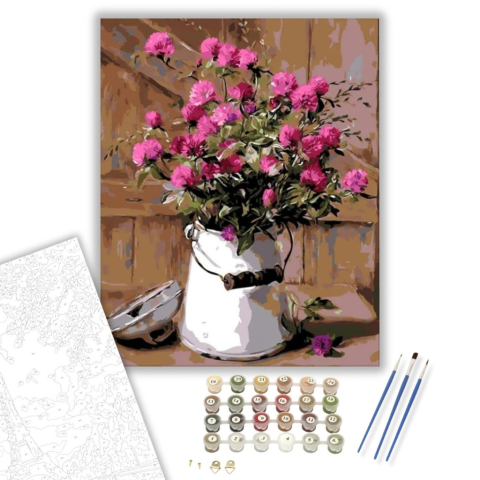Bíborka - számfestő készlet – 40×50 cm (Keretre feszítve) A festmény meleg, otthonos hangulatot áraszt, mintha a természet egy darabja került volna a szobába. Egy régi korsóban pompázó virágok mesélnek az idő múlásáról és az egyszerű szépség örök érvényűs