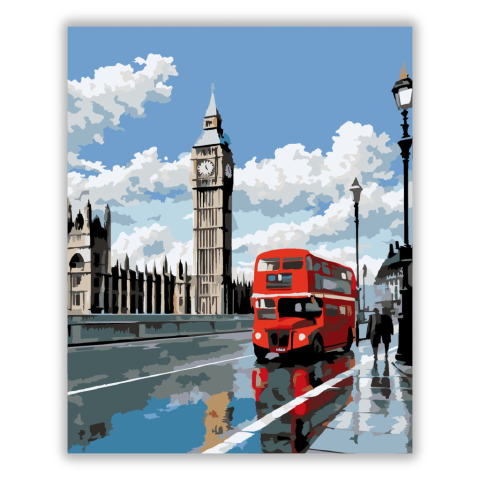 Big Ben és a Piros Busz - számfestő készlet – 40×50 cm (Keret nélkül) A festmény a londoni Westminster Bridge-et ábrázolja, ahol egy ikonikus piros emeletes busz halad át a Big Ben előtt. A kép színvilága élénk, a piros busz kontrasztban áll a kék ég és a