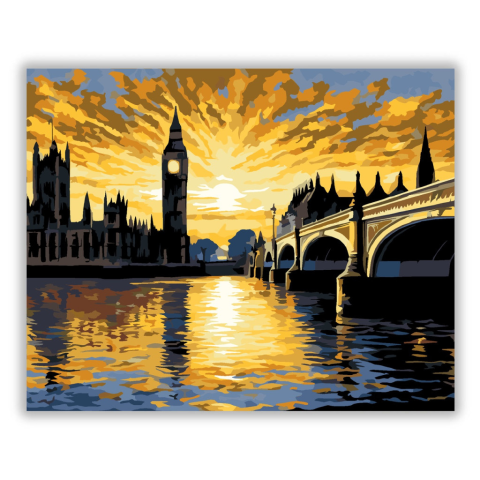 Big Ben és a Westminster Palota Naplementében - számfestő készlet – 40×50 cm (Keret nélkül) A festmény a londoni Big Bent és a Westminster Palotát ábrázolja, ahogy a naplemente aranyló fényei tükröződnek a Temze vízén. A meleg narancs és sárga árnyalatok