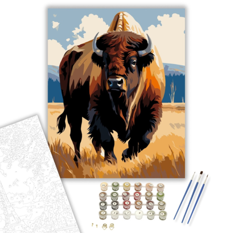 Bölény a Prérin - számfestő készlet – 40×50 cm (Keretre feszítve) A festmény egy hatalmas bölényt ábrázol, amint büszkén áll a végtelen prérin. A kép aranyló és földszínekben pompázik, meleg hangulatot árasztva. A bölény erejét és a természet vad szépségé