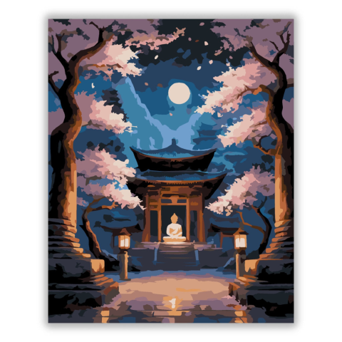 Buddha a Cseresznyevirágos Templomban - számfestő készlet – 40×50 cm (Keret nélkül) A festmény egy éjszakai templomudvart ábrázol, közepén egy ragyogó Buddha szoborral, amelyet lámpások és cseresznyevirágszirmok vesznek körül. A sötétkék égbolt és a halvá