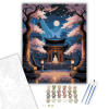 Buddha a Cseresznyevirágos Templomban - számfestő készlet – 40×50 cm (Keretre feszítve) A festmény egy éjszakai templomudvart ábrázol, közepén egy ragyogó Buddha szoborral, amelyet lámpások és cseresznyevirágszirmok vesznek körül. A sötétkék égbolt és a h