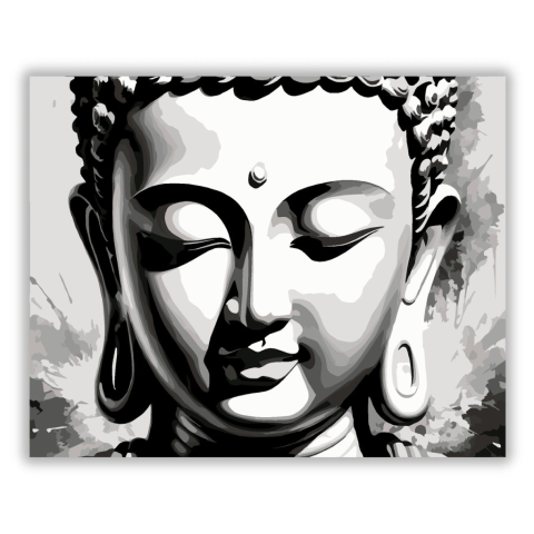 Buddha Arc Nyugalomban - számfestő készlet – 40×50 cm (Keret nélkül) A kép Buddha békés arcát ábrázolja, csukott szemmel, finom ecsetvonásokkal. A fekete-fehér tónusok egyszerűsége nyugalmat és harmóniát sugall. A kép a belső csend és a lelki béke érzését