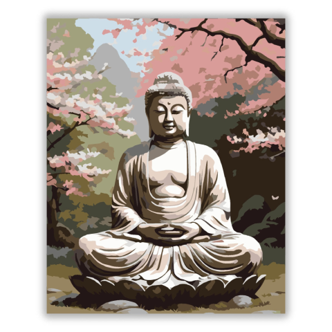 Buddha Cseresznyevirágok Kertjében - számfestő készlet – 40×50 cm (Keret nélkül) A festmény egy Buddha szobrot ábrázol, amely cseresznyevirágokkal borított kertben ül meditációs pózban. A rózsaszín virágok és a zöld háttér harmonikus és nyugtató színvilág
