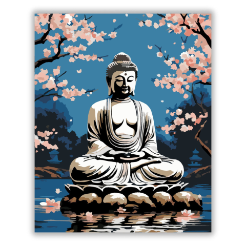 Buddha Cseresznyevirágok Kertjében - számfestő készlet – 40×50 cm (Keret nélkül) A festmény egy meditáló Buddhát ábrázol, aki egy kőhalmon ül, körülötte cseresznyevirágok lebegnek. A háttérben a kék ég és a virágzó fák harmóniát és békét sugároznak. A kép
