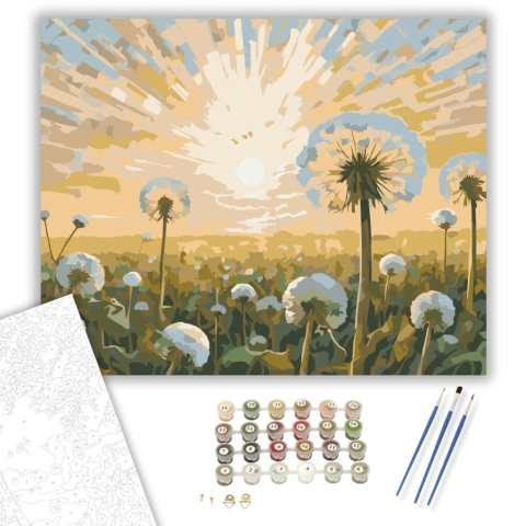 Búzamezői Bóbiták - számfestő készlet – 40×50 cm (Keretre feszítve) A festmény egy mezőt ábrázol, tele pitypangokkal, ahogy a naplemente fényei megvilágítják a fehér bóbitákat. A meleg narancssárga és kék árnyalatok békés, álmodozó hangulatot sugároznak.