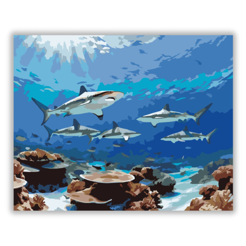 Cápák a Trópusi Vizekben - számfestő készlet – 40×50 cm (Keret nélkül) A festmény több cápát ábrázol, amint egymás mellett úsznak a tiszta, trópusi vizekben, a korallzátonyok felett. A mélykék és türkiz színek harmonikus kombinációja friss és élénk hangul