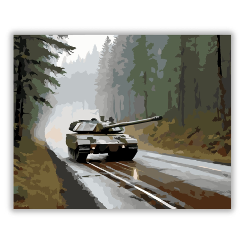 Challenger 2 Tank Erdős Úton - számfestő készlet – 40×50 cm (Keret nélkül) A festmény egy Challenger 2 tankot ábrázol, amint egy esős erdei úton halad konvojt vezetve. A zöldes-barna álcázó festés és a ködös háttér nyugodt, de feszültséggel teli atmoszfér