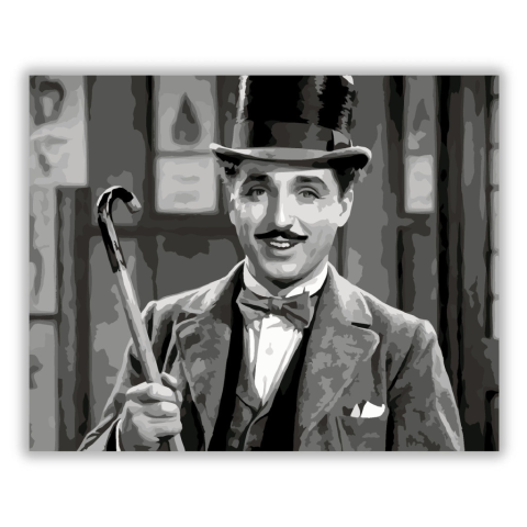 Charlie Chaplin Portré - számfestő készlet – 40×50 cm (Keret nélkül) A festmény Charlie Chaplint ábrázolja jellegzetes öltözékében, kezében sétapálcával és nosztalgikus mosollyal. A fekete-fehér tónusok klasszikus, időtálló hangulatot teremtenek. A kép de