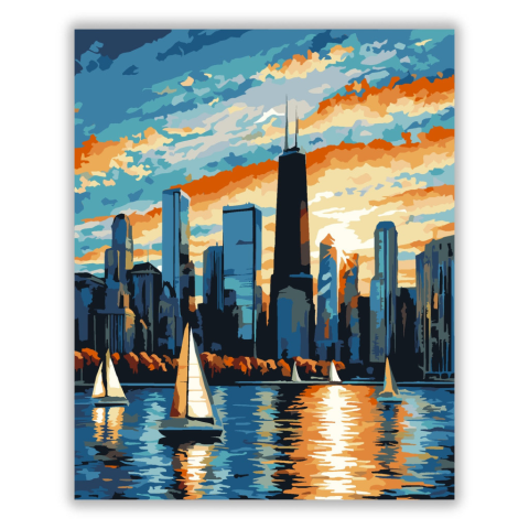 Chicago Belvárosi Látkép Naplementében - számfestő készlet – 40×50 cm (Keret nélkül) A festmény Chicago belvárosának látképét ábrázolja üveg felhőkarcolókkal, amelyek visszatükrözik a lenyugvó nap fényét, miközben vitorlások haladnak a Michigan-tavon. A n