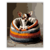 Chihuahua Kötött Pulóverben - számfestő készlet – 40×50 cm (Keret nélkül) A festmény egy apró Chihuahua-t ábrázol, amint egy puha kötött pulóverben ül egy kényelmes kutyaágyban. A kép meleg, földszínekben pompázik, barátságos és otthonos hangulatot teremt