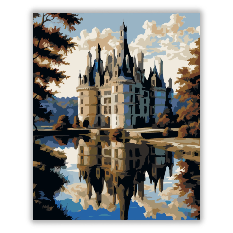 Château de Chambord - számfestő készlet – 40×50 cm (Keret nélkül) A festmény a Château de Chambord mesebeli látványát mutatja be, amelynek tornyai és bonyolult tetőszerkezete tükröződik a mozdulatlan vizesárokban. A kép színvilága a barnás és kékes árnyal