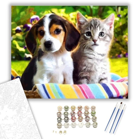 Cica-kutyus barátság - számfestő készlet – 40×50 cm (Keretre feszítve) Ez a festmény melegséget és örömet áraszt, ahogy a két barát közötti kötelék megelevenedik. A cica és a kutyus együtt ülnek egy színes takarón, mintha csak egy varázslatos kalandra kés