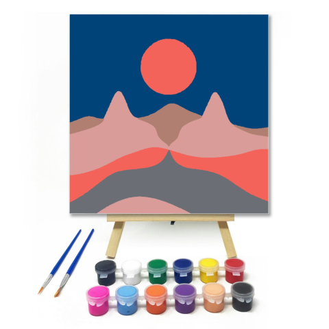 Cica Puszi - gyerek számfestő készlet – 20×20 cm (Keretre feszítve) Ez a kép egy színes naplementét ábrázol, ahol a nap pirosan ragyog a hegyek felett. A barátságos rózsaszín és narancs árnyalatok varázslatos hangulatot teremtenek. Tökéletes választás a g