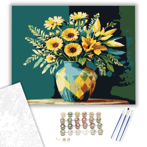 Citromfény kompozició - számfestő készlet – 40×50 cm (Keretre feszítve) Ez a festmény egy csendes reggel hangulatát idézi, ahol a nap első sugarai aranyló fénybe burkolják a virágok szirmait. Egy történet bontakozik ki, amelyben a természet és az otthon m
